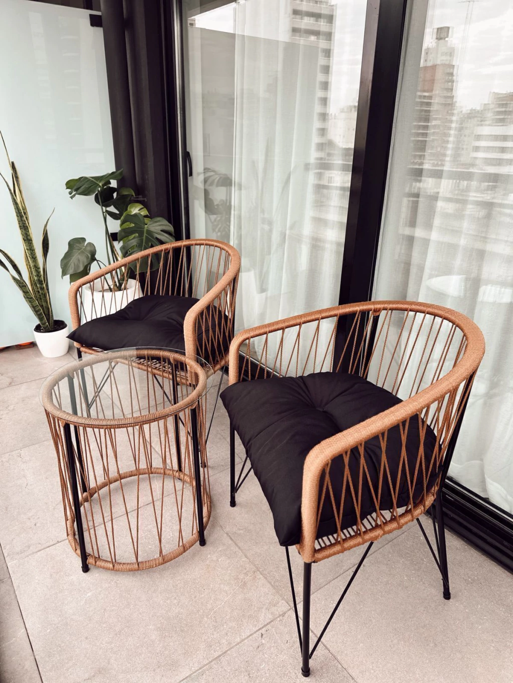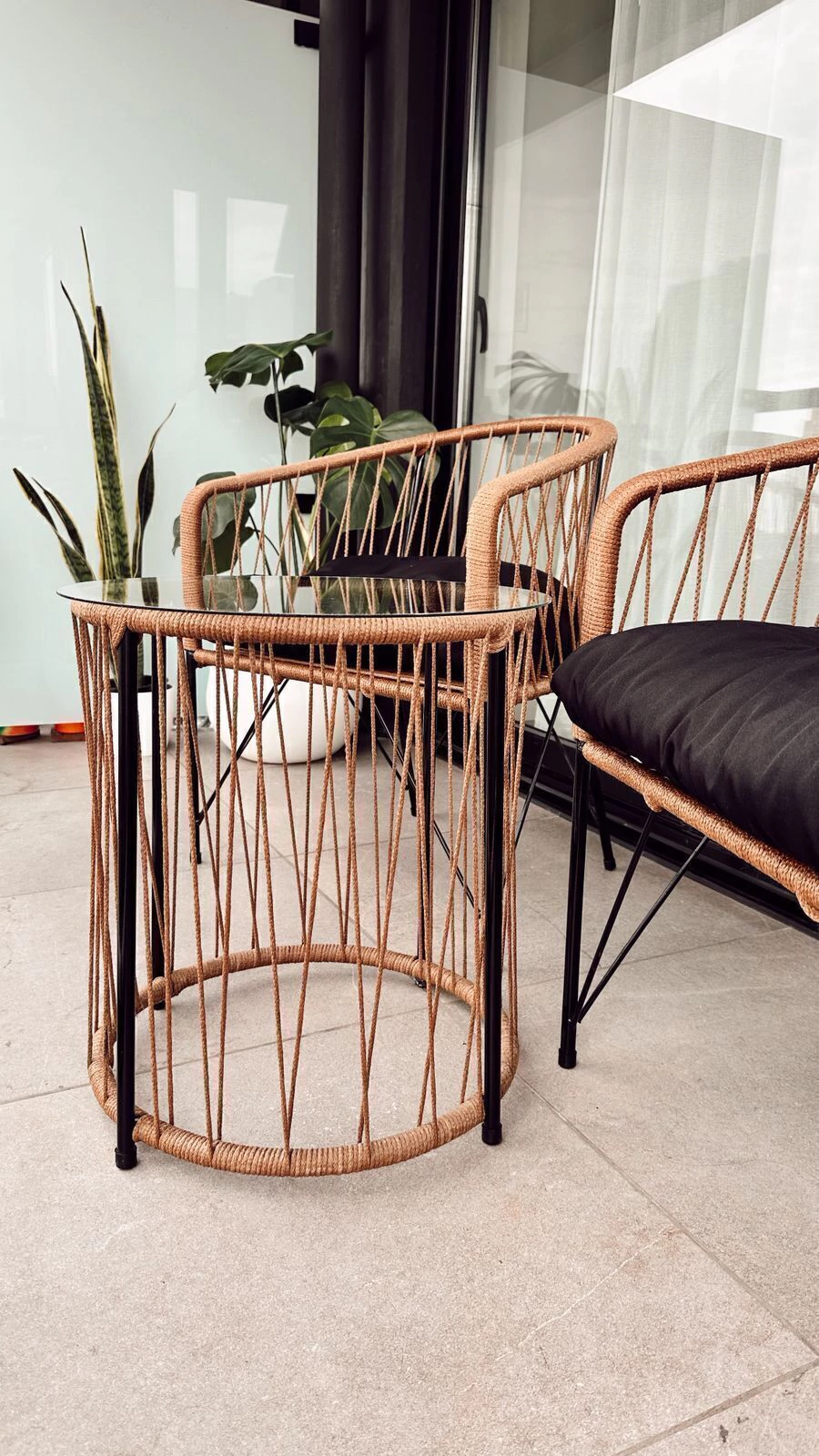 Los sillones están hechos con estructura de hierro color negro y tejido artesanal en soga simil yute, lo que aporta calidez y un acabado natural único. Cada uno es tejido a mano, por eso ningún sillón es exactamente igual, y esa imperfección artesanal es parte de su esencia.